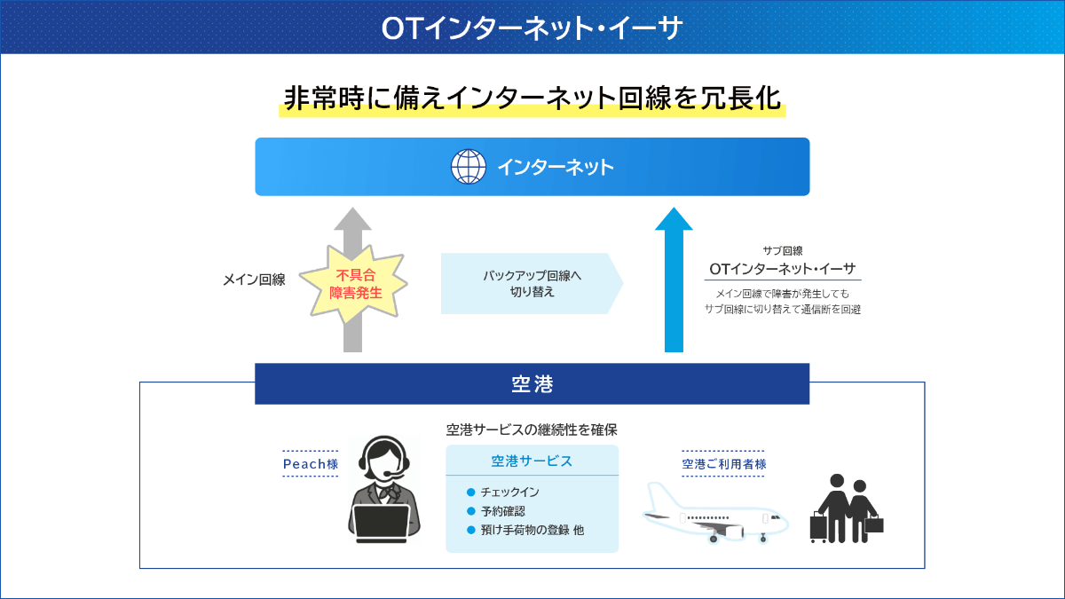 開業当初より、各空港にはバックアップとしてモバイルルーターを配備していましたが、昨今の業務環境の多様化や空港施設の要件により、通常業務でもモバイルルーターを使用する機会が非常に多くなっていました。その結果、使用状況によっては契約しているデータ通信容量を超過し、接続速度が著しく低下してしまうこともあり、非常時に機能すべきバックアップが、肝心な場面で機能しない可能性も懸念されていました。こうした背景から、インターネット回線の冗長化を通じて、安心で安定的な通信環境を構築する必要があると判断し、OTインターネット・イーサの導入を進めることとなりました。